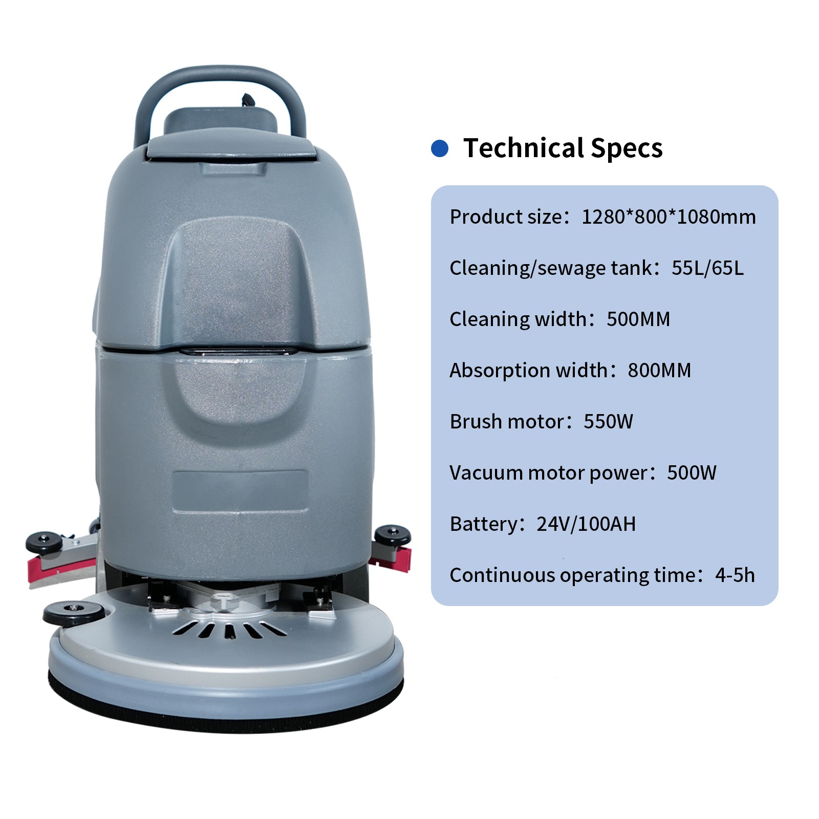 The Compact Floor Scrubber is a high-performance cleaning machine designed for efficient and easy operation. With a cleaning width of 500mm and a 24V/100AH battery, it offers up to 5 hours of continuous use. The 550W brush motor, 500W water suction motor, and 800W drive motor ensure powerful cleaning and suction.