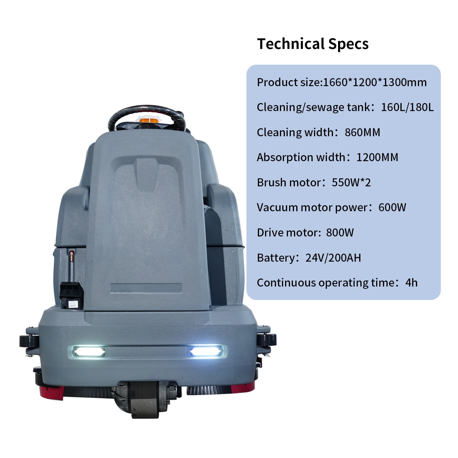 The A860 Ride-On Floor Scrubber is a powerful cleaning machine designed for large spaces. With a cleaning width of 860mm and a 24V/200AH battery, it delivers up to 5 hours of continuous use. The 180L sewage tank and 160L cleaning water tank reduce downtime, while dual 550W brush motors and a 600W water suction motor provide strong cleaning power.